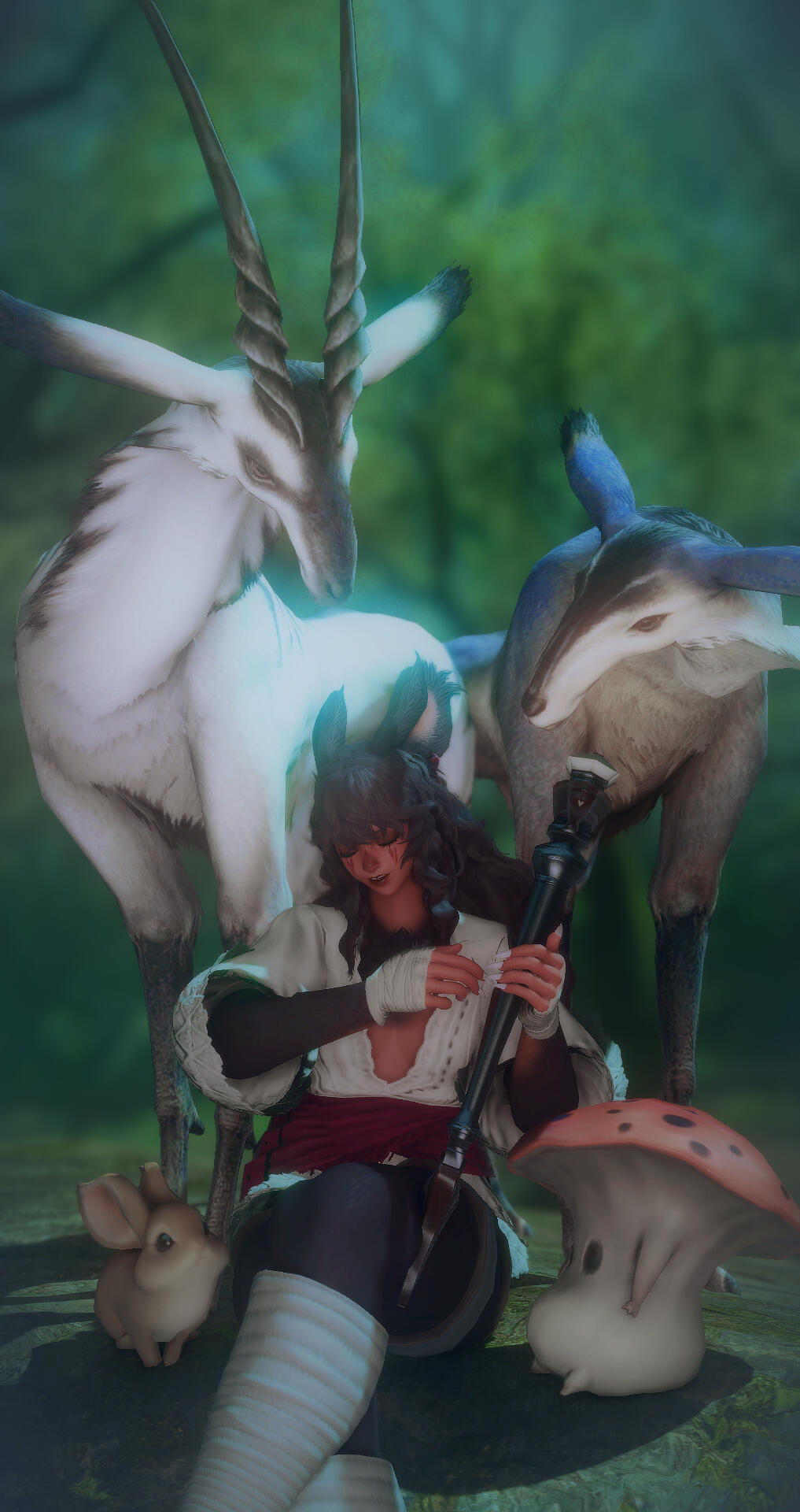 In Kugane, the pair were taken in by a tea house worker, but the most they were granted was a place to live. To make ends meet, both siblings took up odd jobs around Kugane, each making use of their own respective talents in order to scrape together enough funding to continue to survive.By the time they turn 19, they decide to finally leave Kugane behind and instead make their journey to Eorzea, where they briefly resided in Limsa Lominsa before eventually settling in Gridania. Here, they are able to finally stabilize and gather their bearings, joining up with the archer and conjurer guilds, Valentyne learning the bow while Kinara decides to take to the cane.